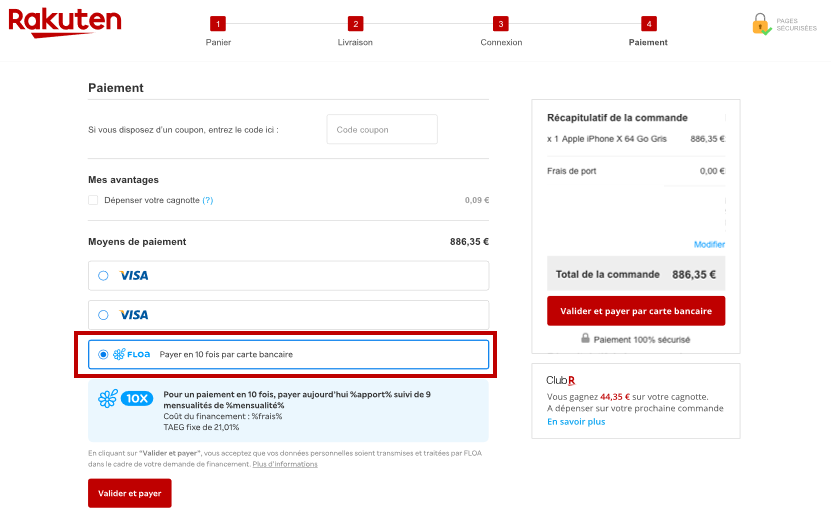 L'option de paiement 10XCB Floa est disponible pour les achats entre 200 € d'achat et jusqu'à 3 000 €.